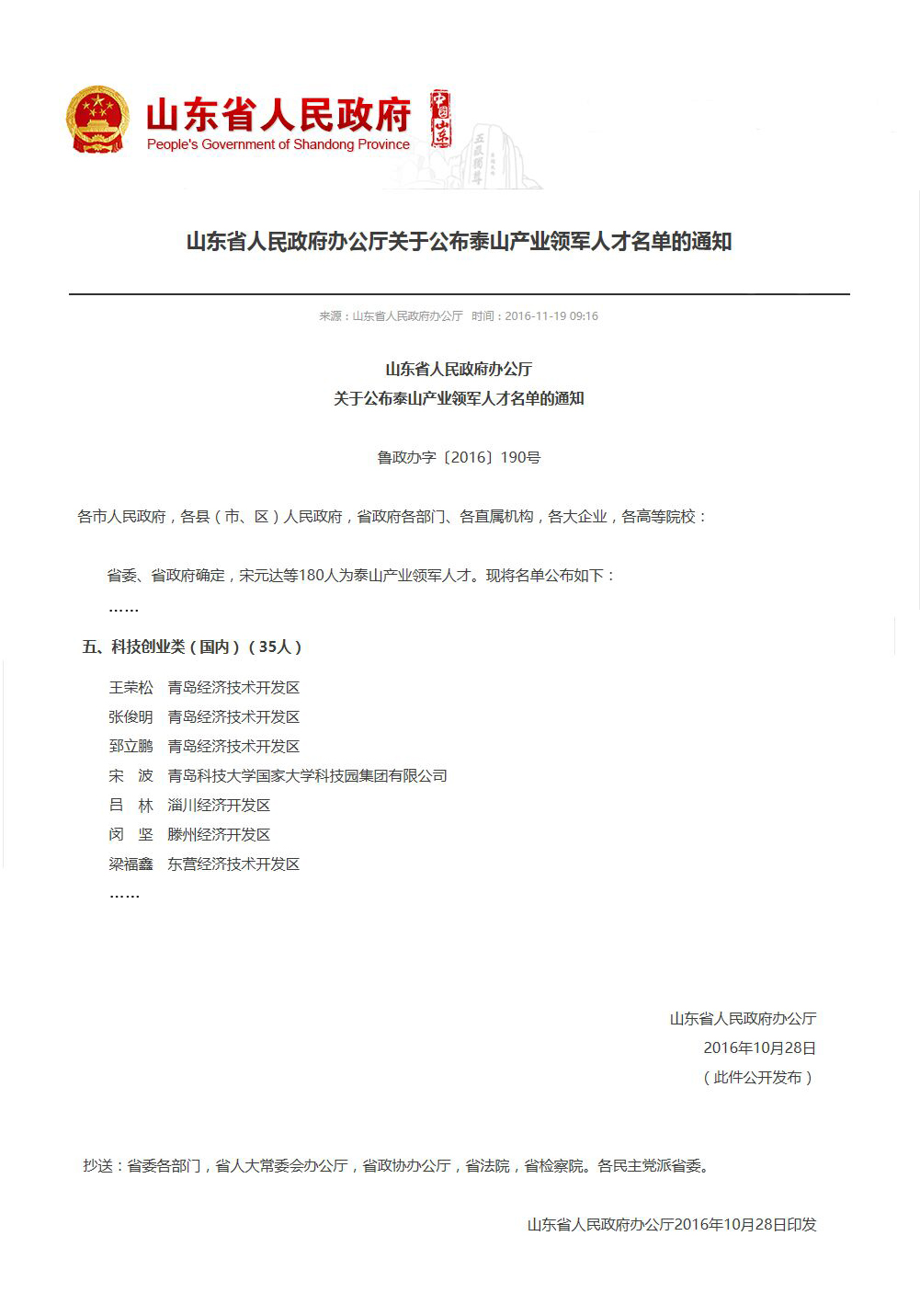 近日,按照山东省人才工作领导小组统一部署,由省委组织部具体组织实施,经过申报、初审、专家评审及现场考评等程序。由我校国家大学科技园推荐的宋波博士,成功当选为山东省科技创业类泰山产业领军人才。这是我省唯一一位由大学科技园推荐的高校教师。